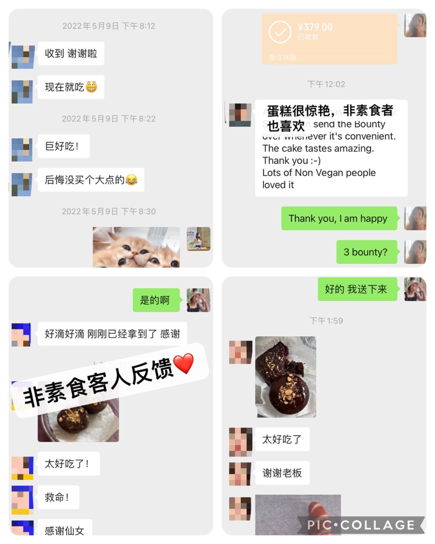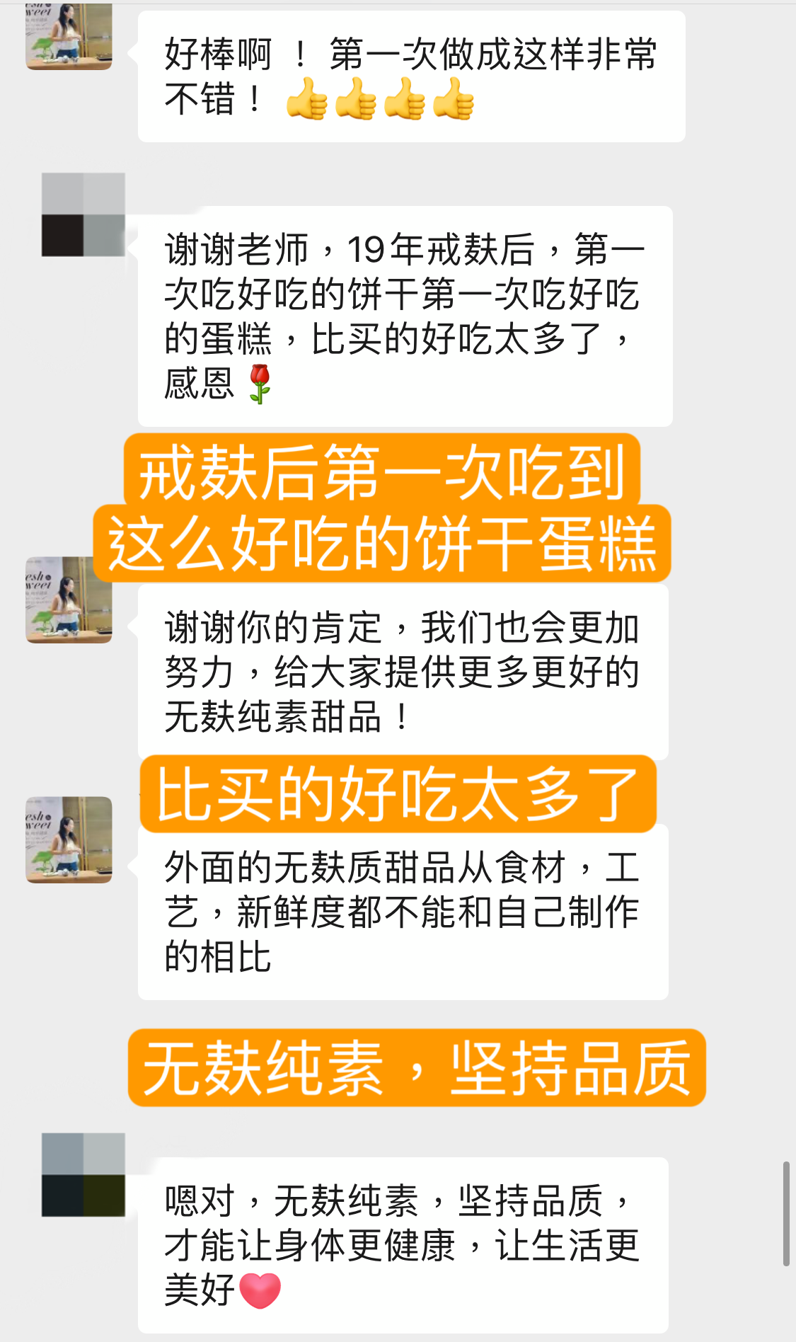 我们从开始做甜品就经常参加线下和一些公益活动,收获了一大堆真实线上线下粉丝,其中很多是外国友人,是他们一直支撑我们走下来, 好不好吃问客户就知道了,我不遗余力的去研发完善我们的配方,跟随世界各地的老师学习,从未停止学习,最终我发现纯素甜品要想走的更远不是靠精美的外表也不是靠复杂的技术,而是简璞归真,我们中国市场甚至大多数国家还不能够买到轻松纯素奶油纯素黄油,可以买到价格也很昂贵,大部分人还是希望可以学到简单,容易,好吃的纯素甜品,当然材料也随手可得,并且在味道与健康中找到平衡,最终打动人的还是味道和品质!外表每个人都可以模仿,但是内涵却不是谁都可以模仿的.