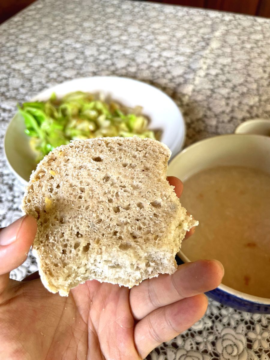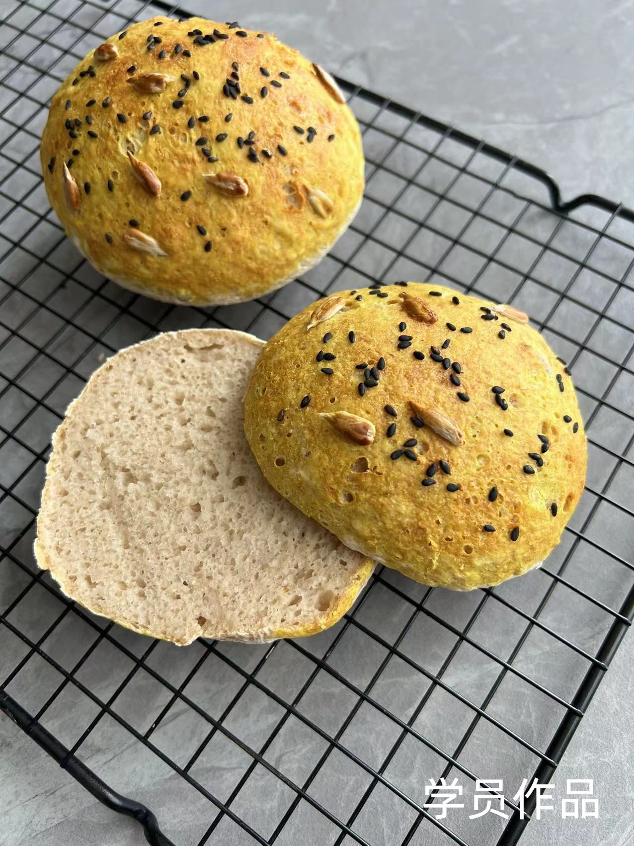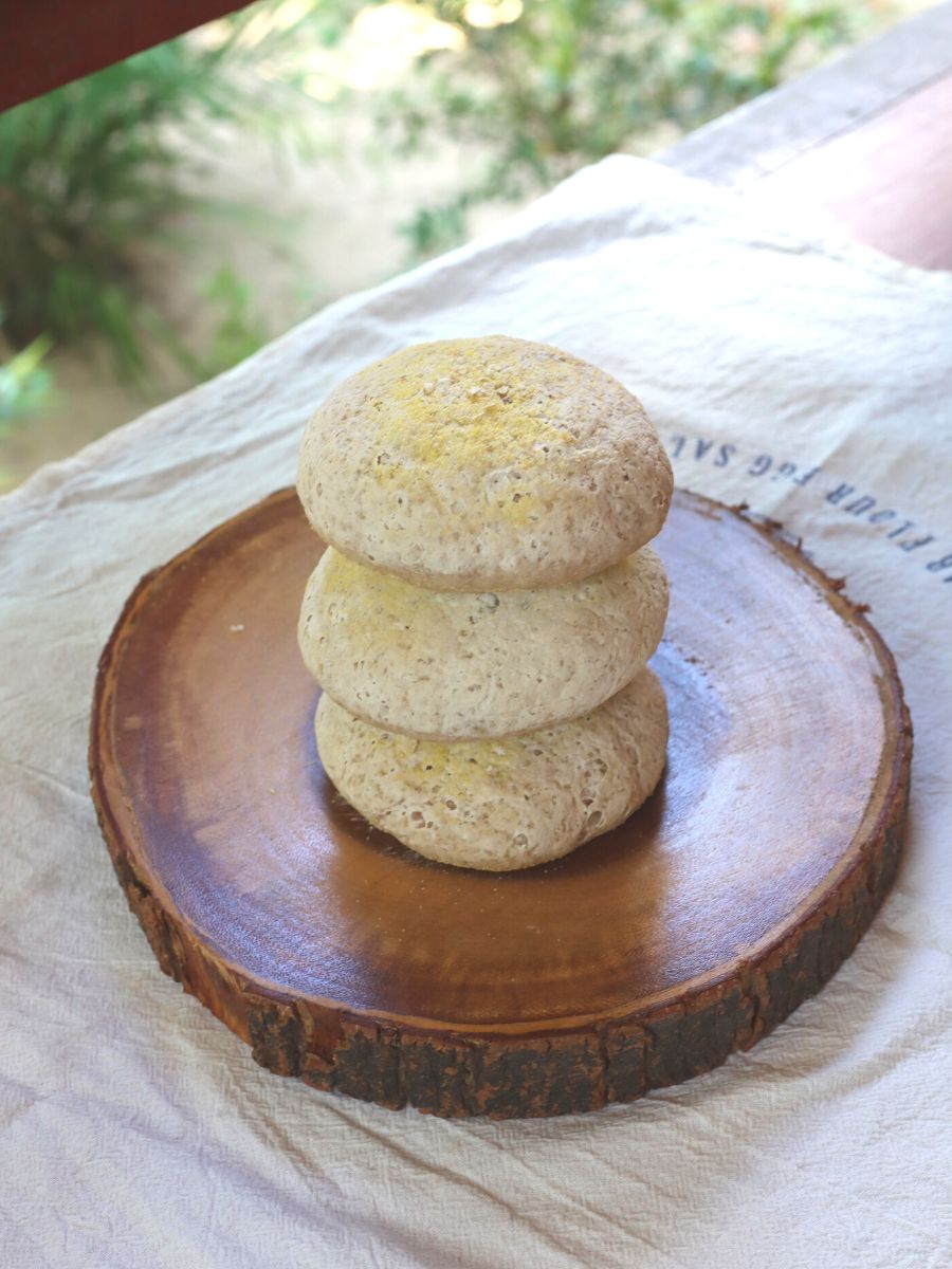 无麸质餐包-不同于很多无麸质产品凉了之后很硬,这款还是软的. 外表比较朴实,适合家用和商用,可以自己加入一些干果和坚果,它是一款餐包,口感更类似杂粮馒头和杂粮欧包之间,口感不像吐司那么柔软和细腻. 但是我们无论拿它当中餐配咸菜粥还是西式中间夹上馅料抹上素黄油都好吃,长期无麸质人群来说可以成为一款日常餐包. 食材成本只需要2元一只. 制作需要两次发酵大约(1.5-2小时)完成.