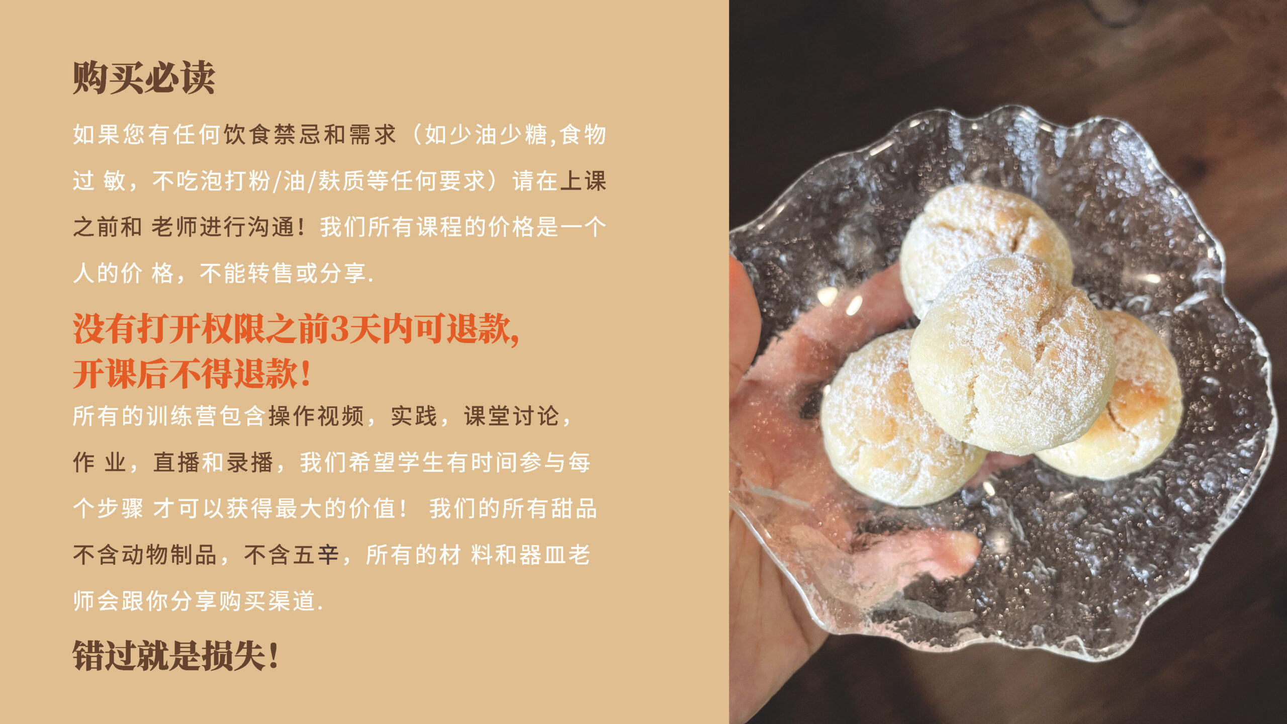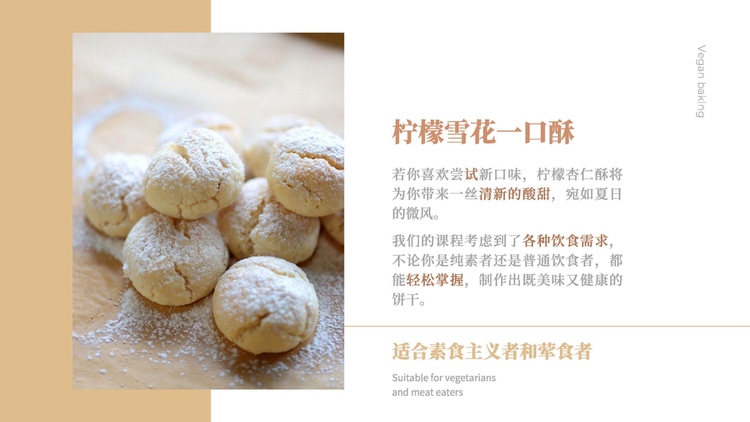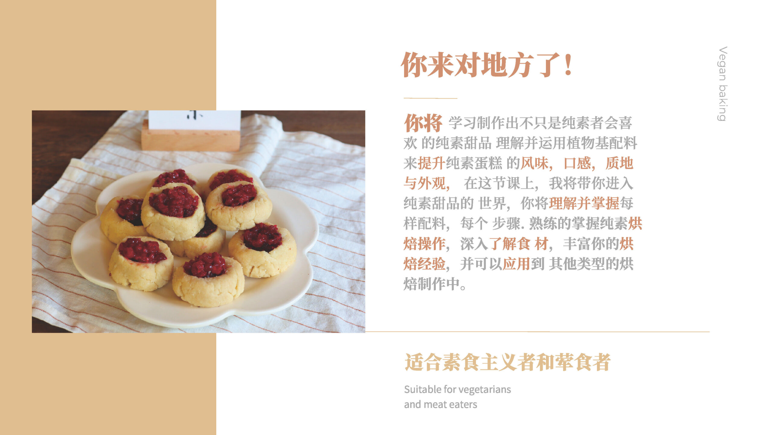 欢迎您踏入纯素杏仁酥饼干的甜美世界!在这堂课中,YEYU老师将与您分享无添加手工果酱的制作过程,让您体验从新鲜水果到香浓果酱的魔法转变。然后,一同深入经典纯素杏仁酥的制作心得,品味那均匀、酥脆的口感,探索杏仁的香醇与饼干的和谐结合。若你喜欢尝试新口味,柠檬杏仁酥将为你带来一丝清新的酸甜,宛如夏日的微风。我们的课程考虑到了各种饮食需求,不论你是纯素者还是普通饮食者,都能轻松掌握,制作出既美味又健康的饼干。让我们一同在纯素烘焙的世界里,品尝每一片酥脆的美好。