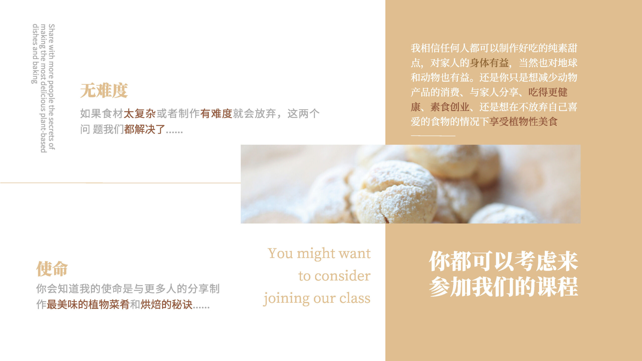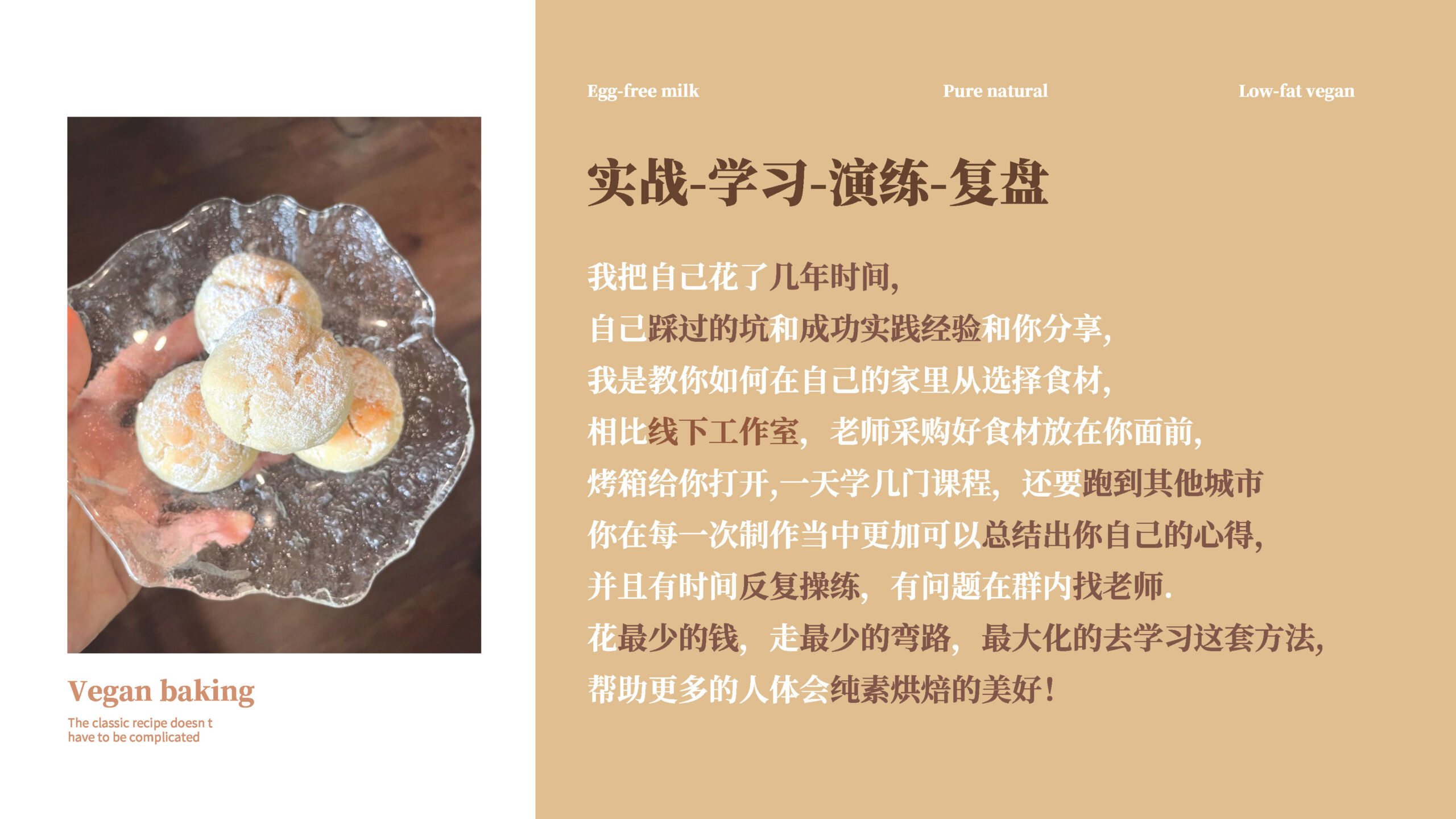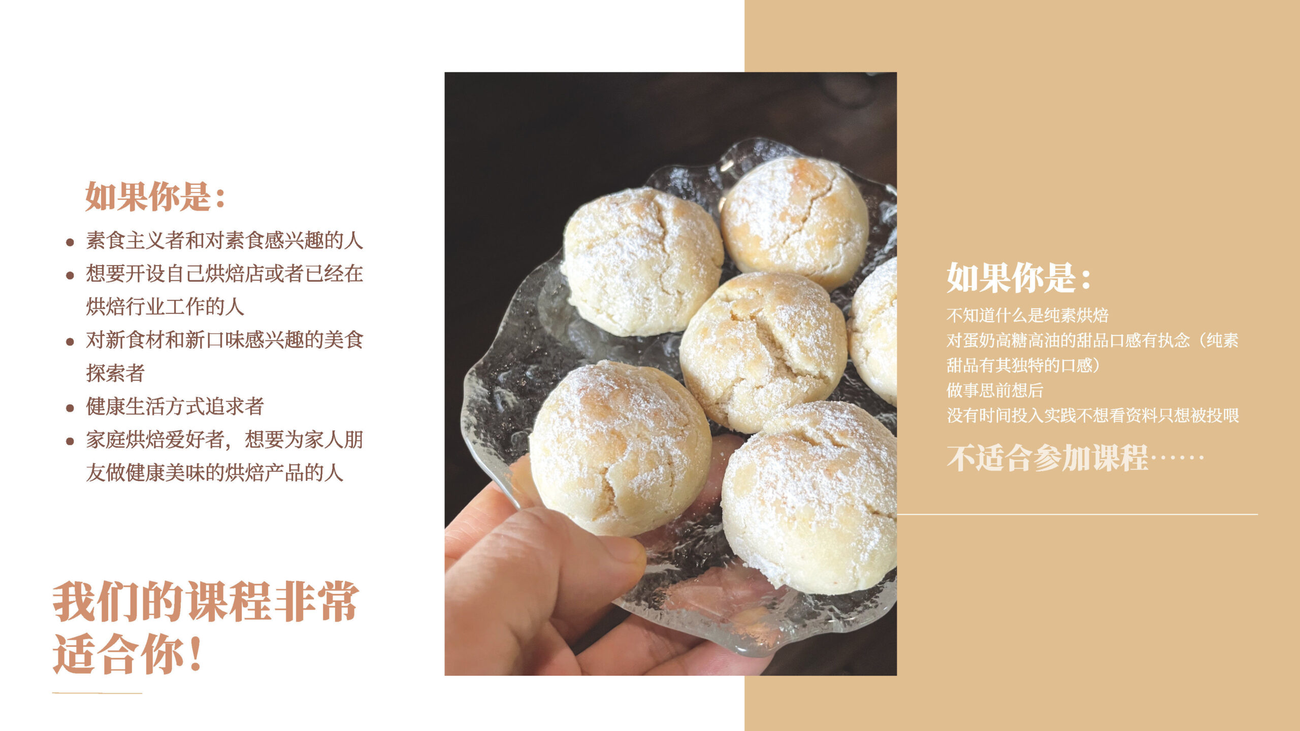 欢迎您踏入纯素杏仁酥饼干的甜美世界!在这堂课中,YEYU老师将与您分享无添加手工果酱的制作过程,让您体验从新鲜水果到香浓果酱的魔法转变。然后,一同深入经典纯素杏仁酥的制作心得,品味那均匀、酥脆的口感,探索杏仁的香醇与饼干的和谐结合。若你喜欢尝试新口味,柠檬杏仁酥将为你带来一丝清新的酸甜,宛如夏日的微风。我们的课程考虑到了各种饮食需求,不论你是纯素者还是普通饮食者,都能轻松掌握,制作出既美味又健康的饼干。让我们一同在纯素烘焙的世界里,品尝每一片酥脆的美好。